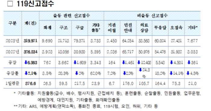 119신고는 2019년 이후 4년 동안 꾸준히 증가하다 지난해 처음으로 감소세로 돌아섰다. 화재‧구조‧구급 등의 신고는 예년과 비슷한 수준이지만, 코로나19 종식에 따라 의료상담 안내가 1만2408건(24.3%)이 감소한 것이 영향을 미쳤다.