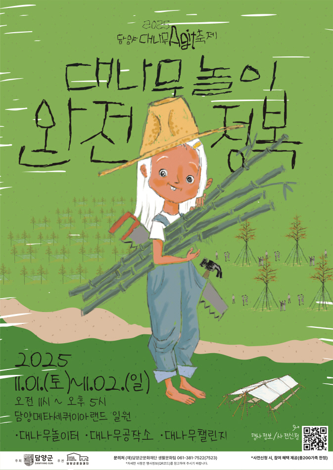 담양군문화재단(이사장 정철원, 이하 재단)은 11월 1일부터 2일까지 이틀간 담양 메타세쿼이아랜드 일대에서 전 세대를 위한 참여형 문화예술교육축제, <2025 담양대나무아지트축제:대나무놀이X완전정복>을 개최한다고 밝혔다.