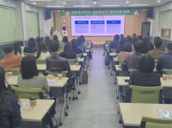 이번 연수는 전남대학교병원 정신건강의학과 이주연 교수를 모시고 진행하였으며, 학습 과정에 영향을 미치는 아동·청소년의 정신건강 문제에 대한 깊이 있는 이해와 실제적인 지원 방안을 모색하는 자리로 마련되었다.