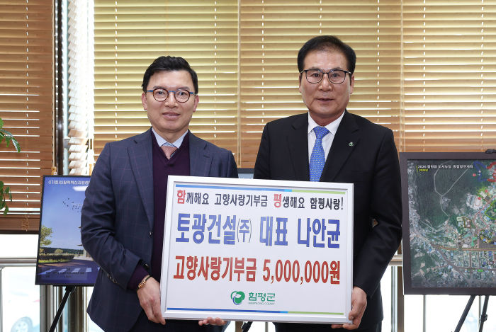 함평군은 “㈜토광건설 나안균 대표가 지난 7일 함평군청을 직접 방문해 고향사랑기부금 최고 한도액인 500만원을 쾌척했다”고 8일 밝혔다.