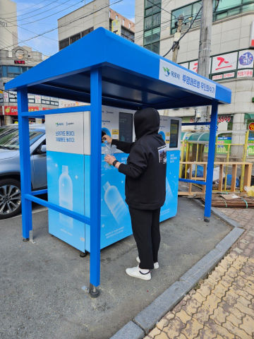 ▲투명페트병 무인회수기 사업은 관내 행정복지센터 등 9개소에 설치된 무인회수기에 투명페트병을 버리면 이용자에게 개당 10원이 적립되어 현금으로 환전하여 사용할 수 있다.
