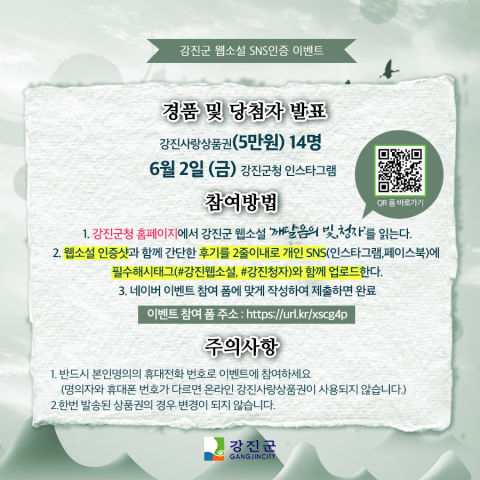 5월 이벤트는 5월 8일을 시작으로 5월 28일까지 21일간 진행되며, 웹소설을 구독하고 인증샷과 함께 간단한 후기 및 필수 해시태그(#강진웹소설, #강진청자)를 업로드 하면 추첨을 통해 강진사랑상품권(5만 원)을 14명에게 제공한다.