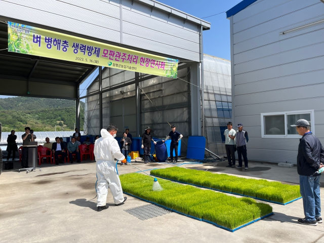 함평군 농업기술센터가 본격적인 농사철을 맞아 벼 병해충 생력방제를 위한 ‘모판 관주 처리’ 현장 연시회를 열었다.