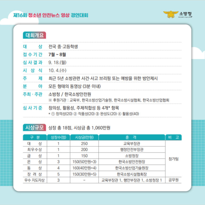 소방청 주관으로 시행되는 이번 대회는 생활 속 안전 문제 및 개선 대책을 청소년의 시각으로 발굴하여 대국민 안전 문화 확산에 기여하고자 마련됐다.