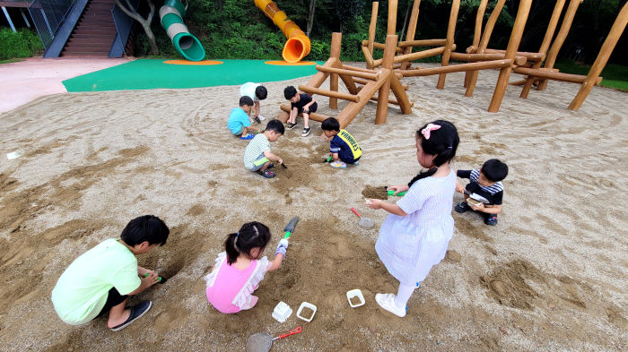 특히 숲속 놀이터는 자연휴양림과 유아숲 체험원이 위치한 흑석산의 자연환경을 최대한 활용해 목재 놀이시설과 맨발 놀이터 등을 조성, 청정한 자연속에서 건강하게 놀이 활동을 즐길 수 있도록 특성화된 놀이터로 조성했다.