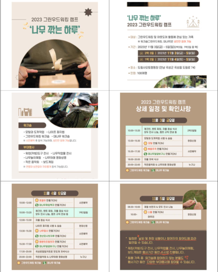 그린우드워킹(GreenWoodWorking) 캠프는 11월 3일부터 5일까지 운영되는 2박 3일 체험과 11월 4일부터 5일까지 운영되는 1박 2일 체험 중 원하는 일정을 선택해 참여하면 된다.